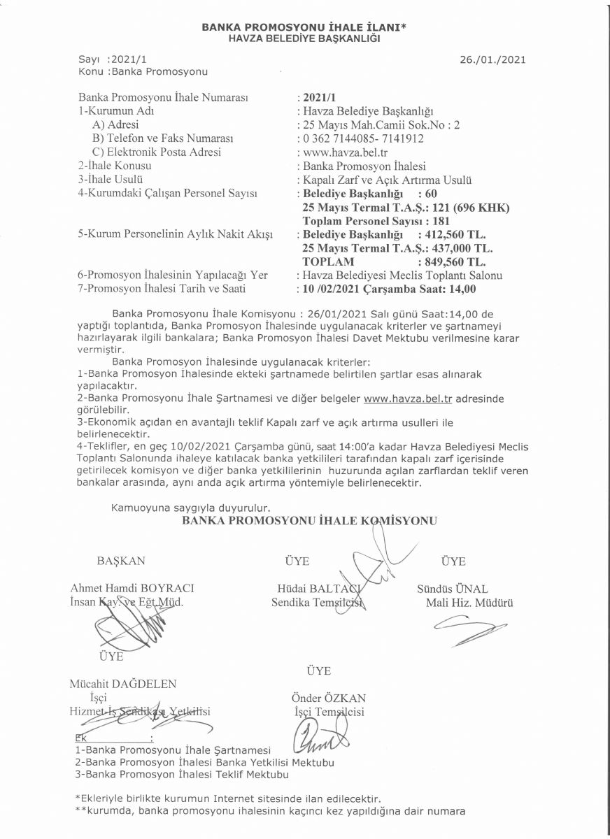 Belediyemiz Banka Promosyonu İhale Komisyonu tarafından 26/01/2021 Salı günü Saat: 14,00 de yaptığı toplantısında alınan karar doğrultusunda Banka Promosyon İhalesi 10 /02/2021 Çarşamba Saat: 14.00 Havza Belediyesi Meclis Toplantı Salonunda yapılacaktır. Banka Promosyonu İhale ilanı metni ektedir.